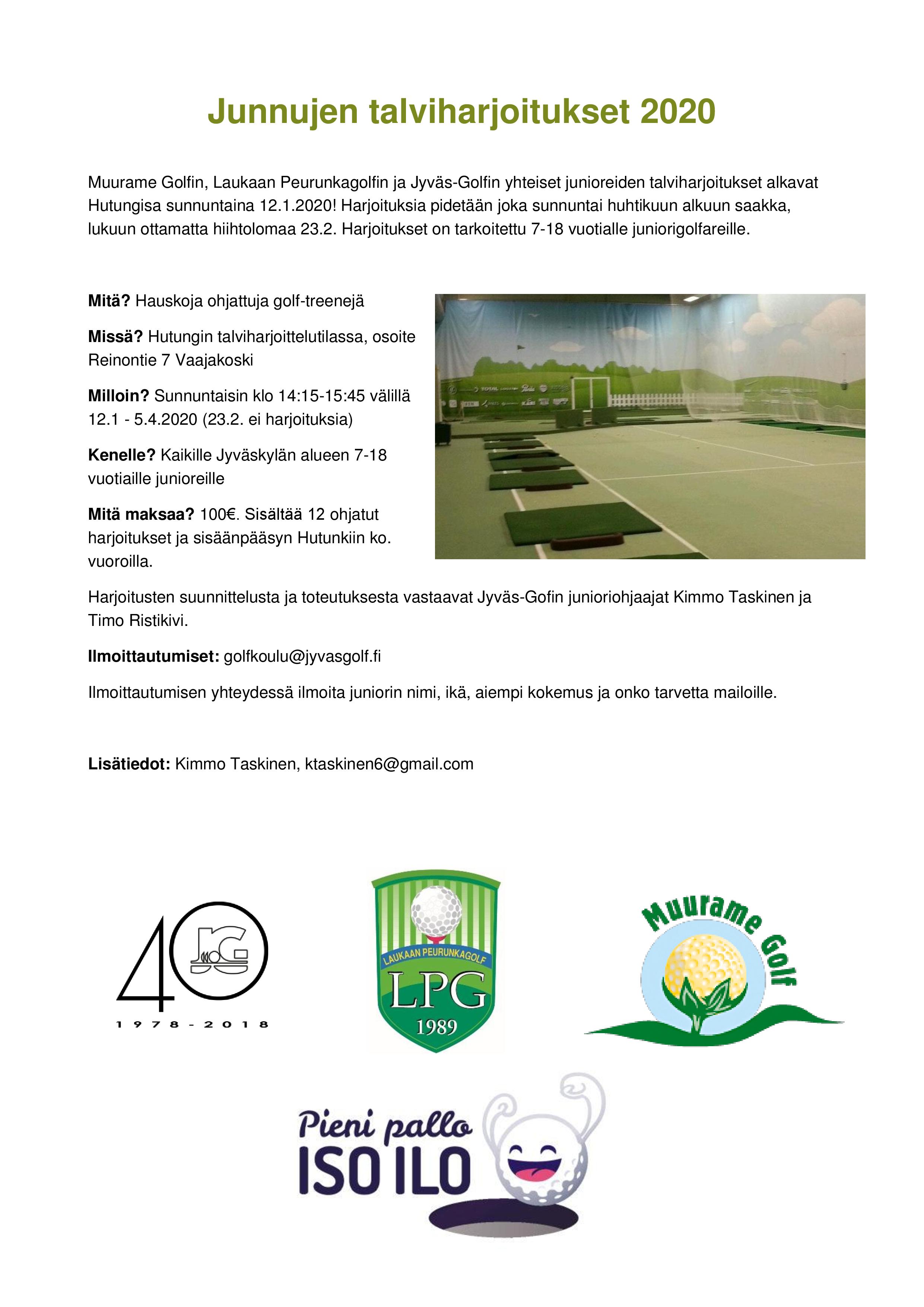 Muurame Golfin, Laukaan Peurunkagolfin ja Jyväs-Golfin yhteiset junioreiden talviharjoitukset alkavat Hutungisa sunnuntaina 12.1.2020! Harjoituksia pidetään joka sunnuntai huhtikuun alkuun saakka, lukuun ottamatta hiihtolomaa 23.2. Harjoitukset on tarkoitettu 7-18 vuotialle juniorigolfareille.